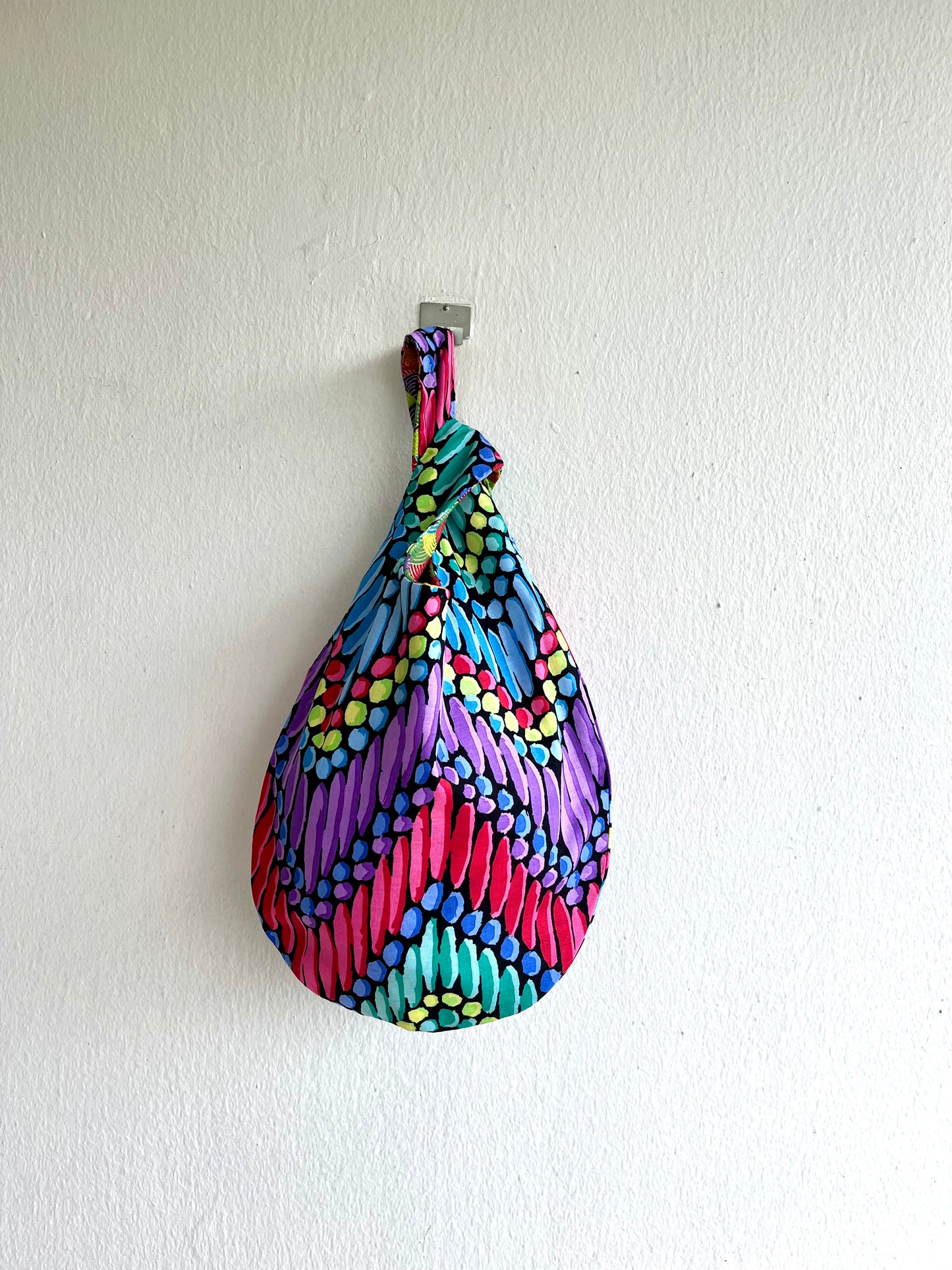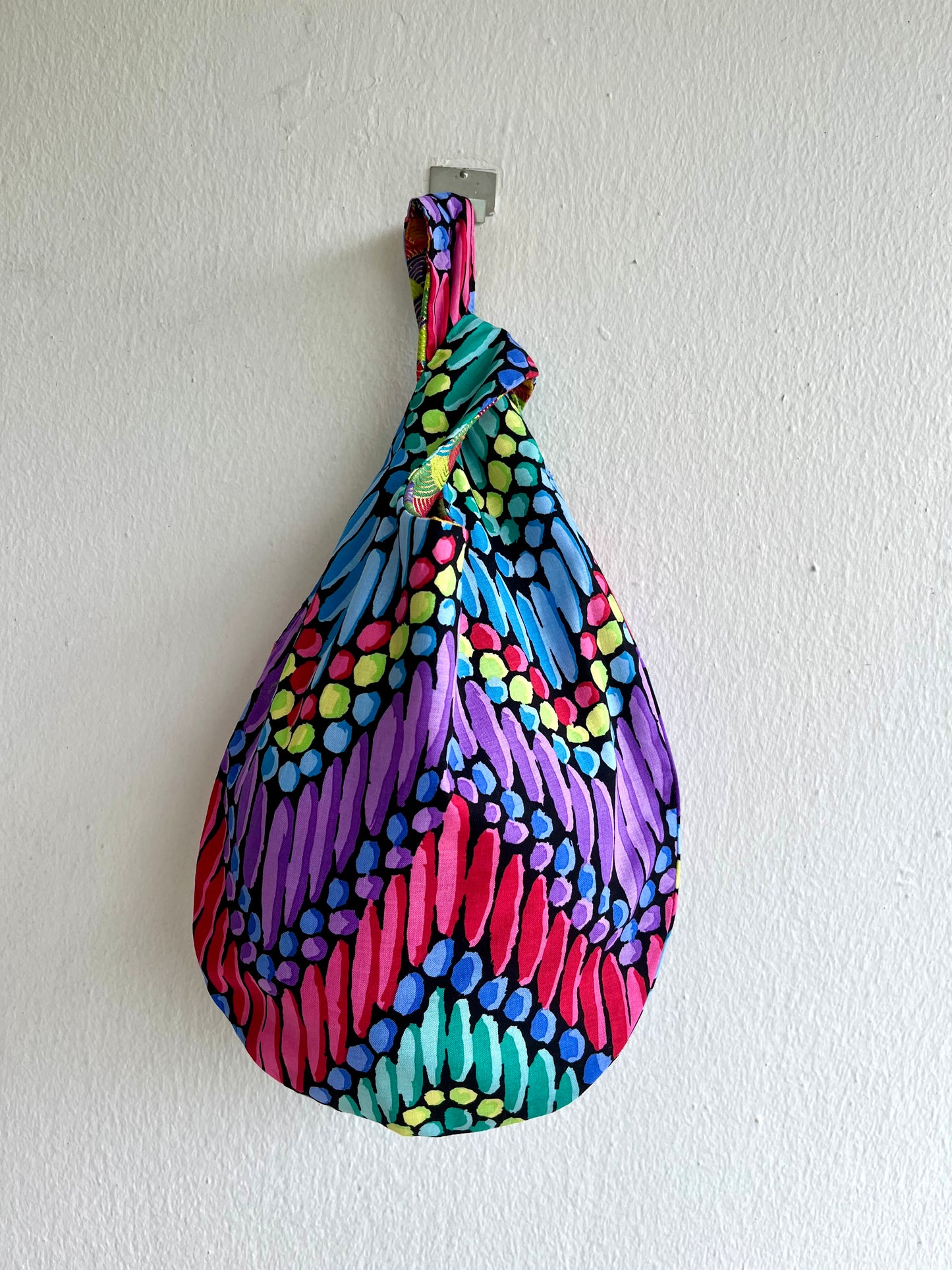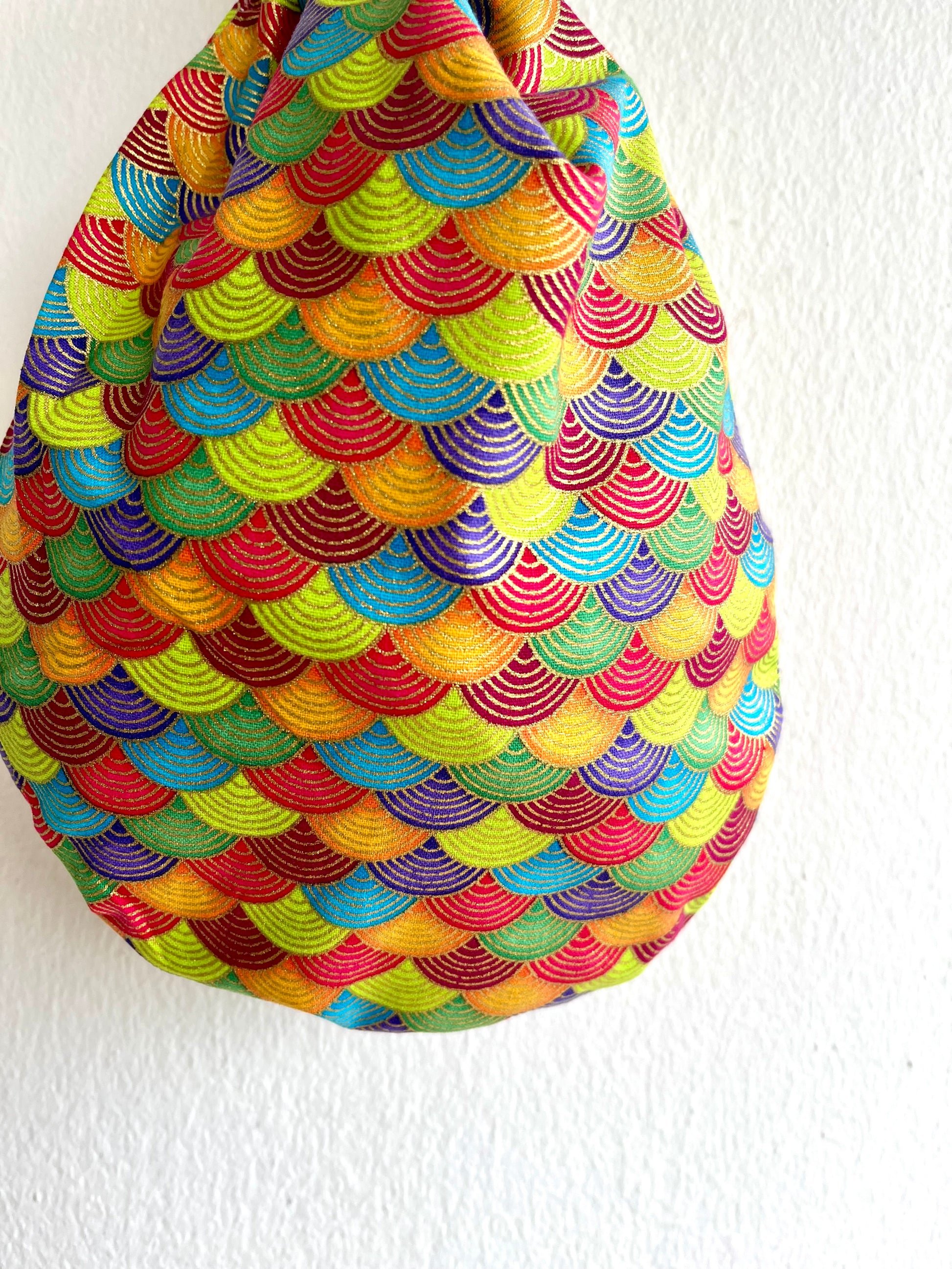 This one-of-a-kind Kiki Bag 'Wicked' is designed with a bold fabric that we found in Sigapore´s China town ,for the reverse side we chose a colorful waves print Japanese fabric with gold details.