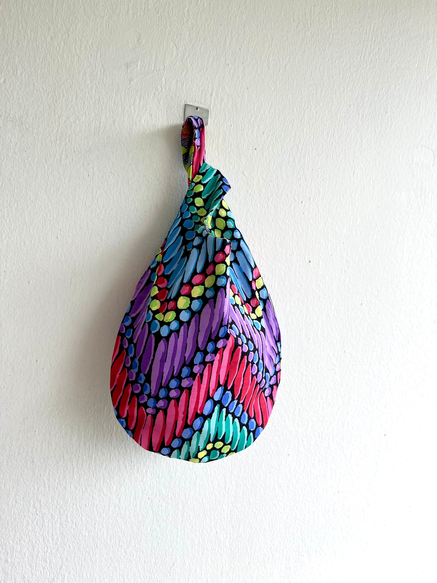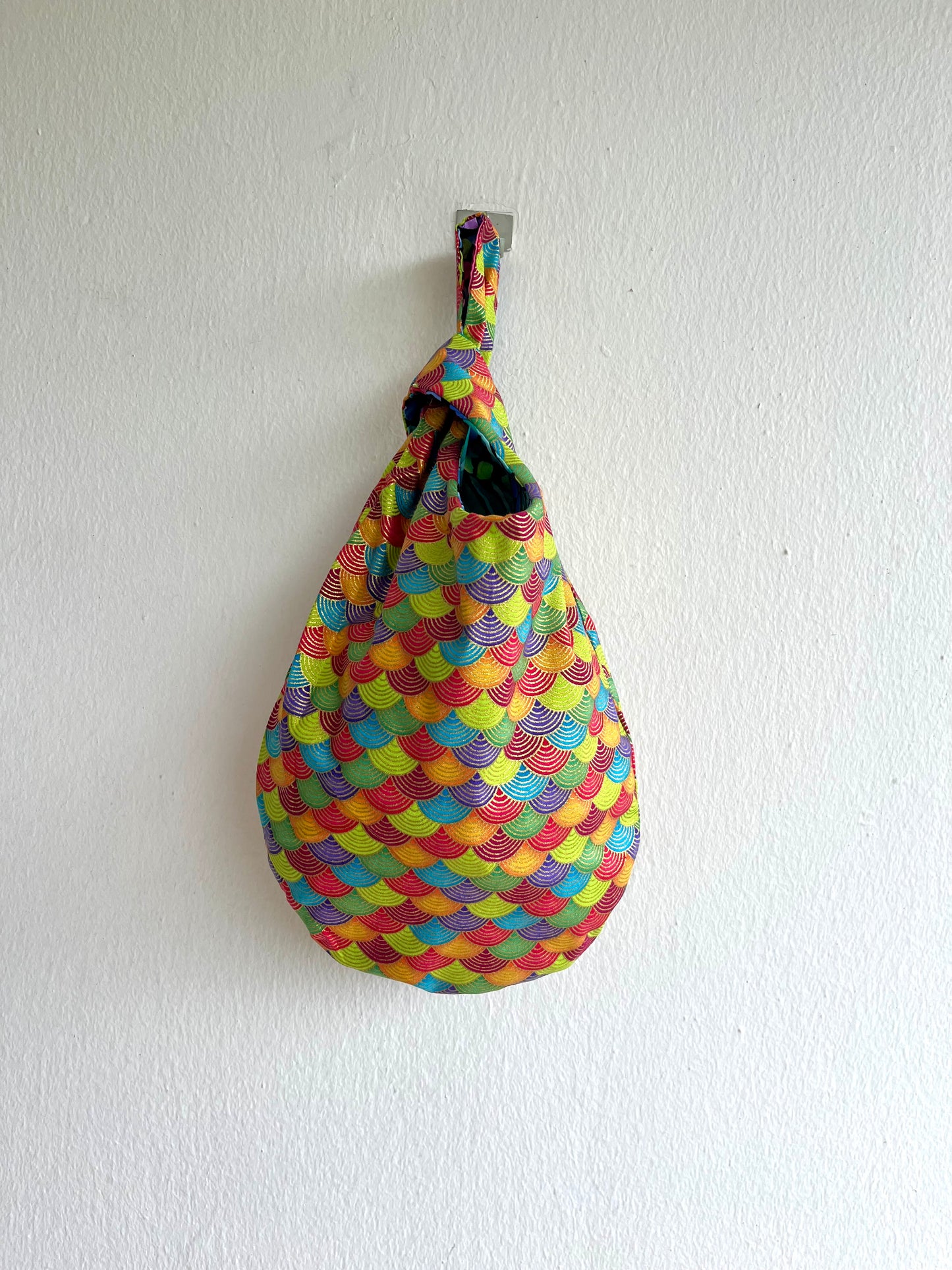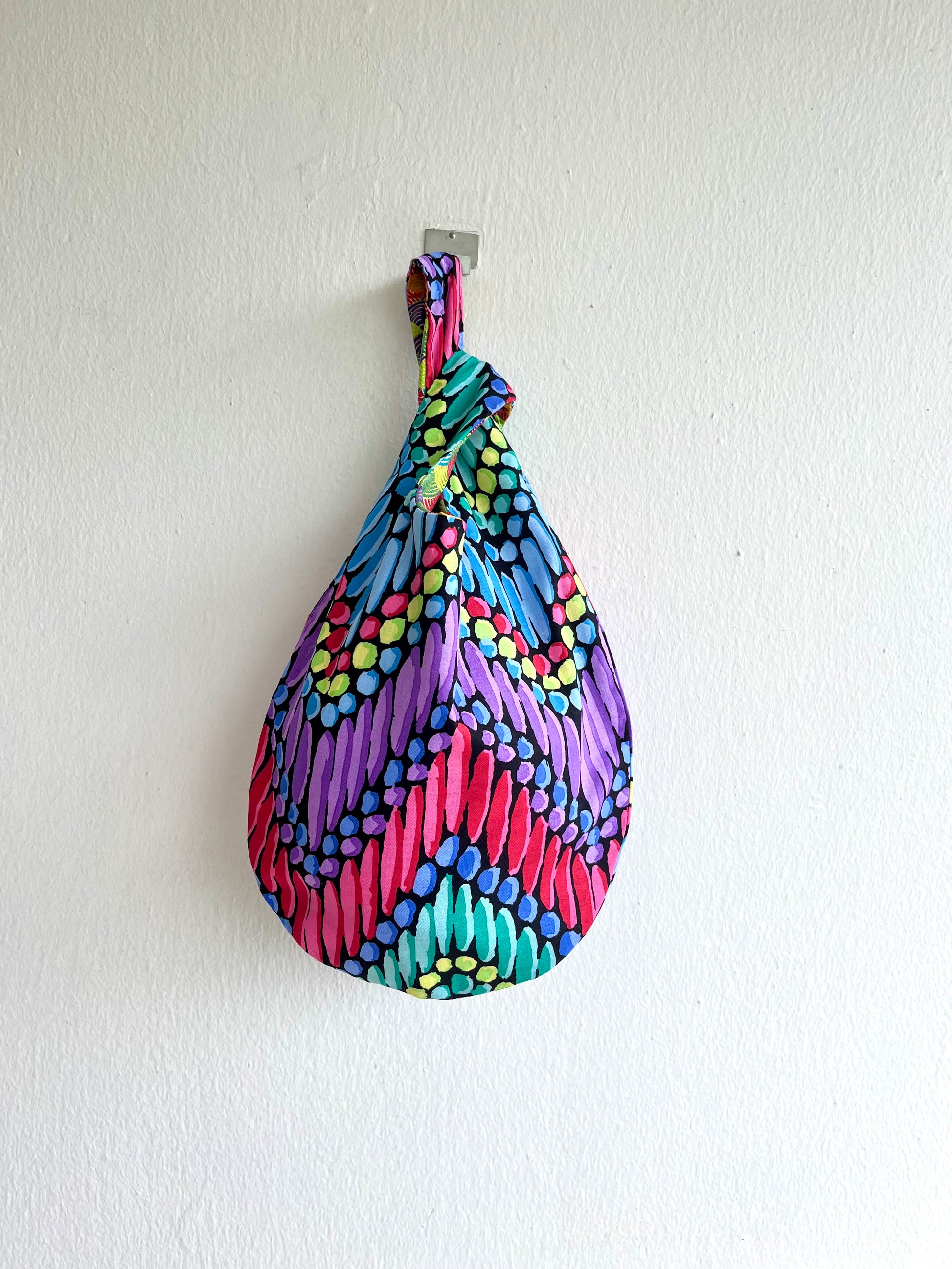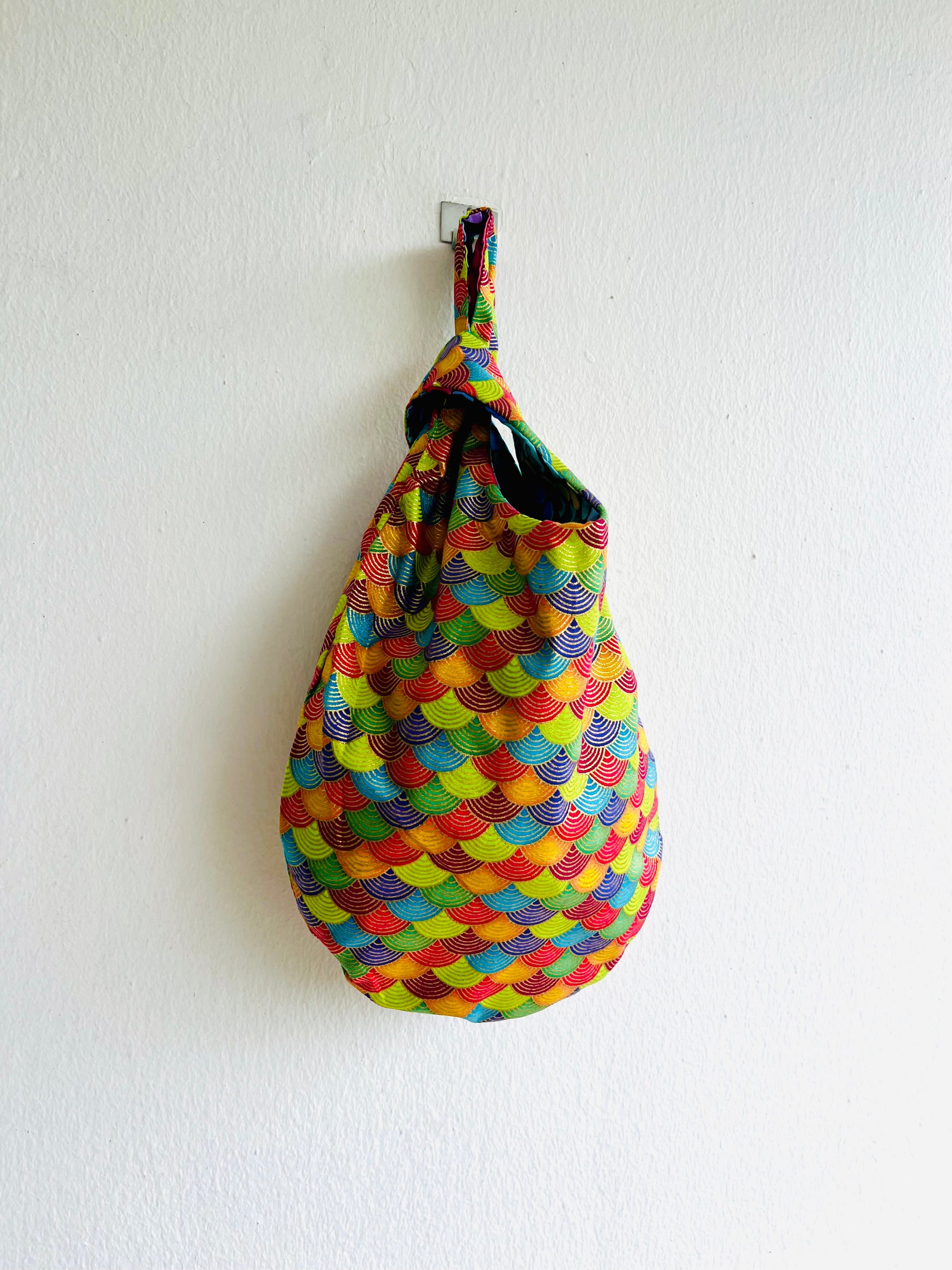 This one-of-a-kind Kiki Bag 'Wicked' is designed with a bold fabric that we found in Sigapore´s China town ,for the reverse side we chose a colorful waves print Japanese fabric with gold details.