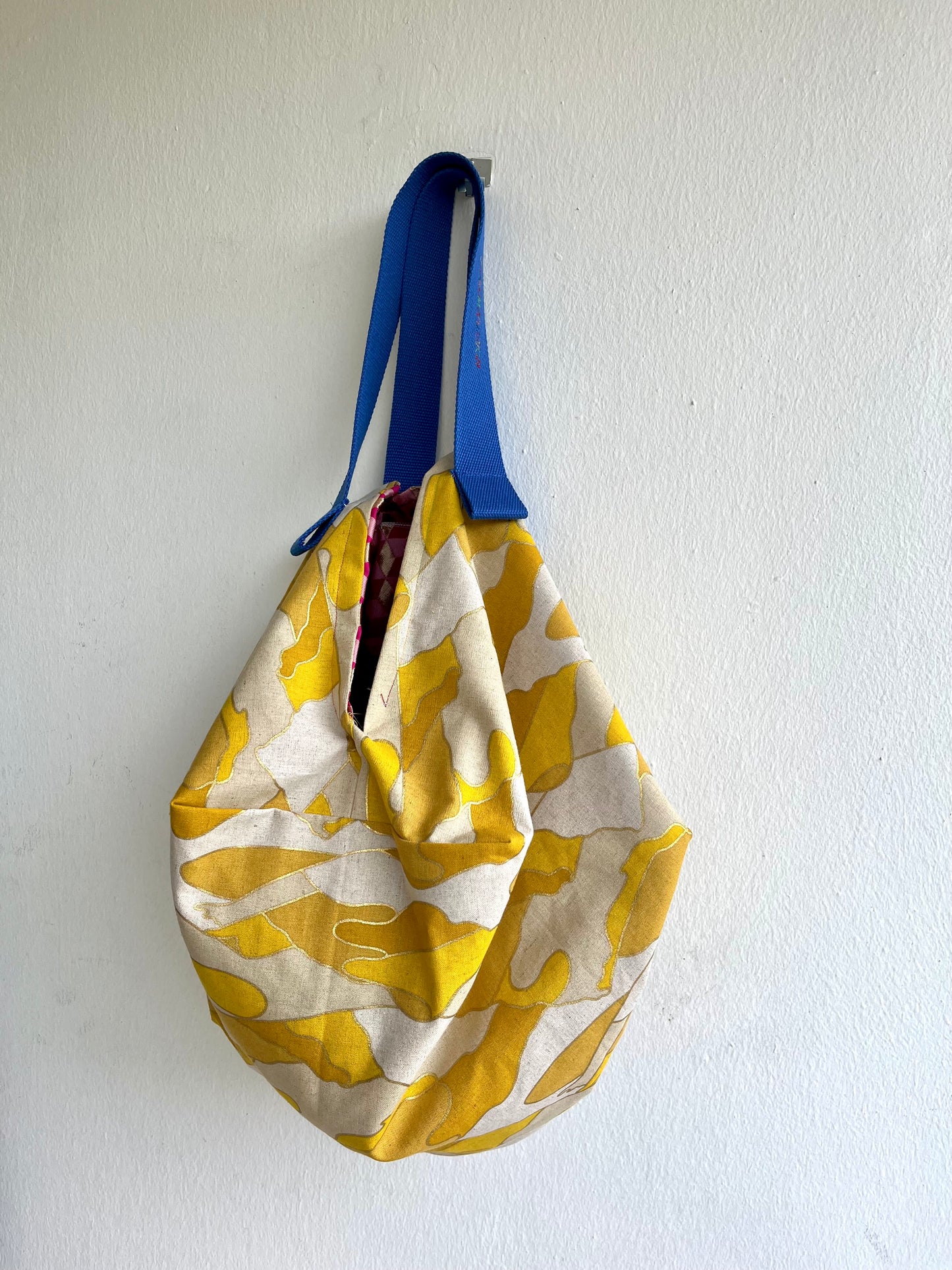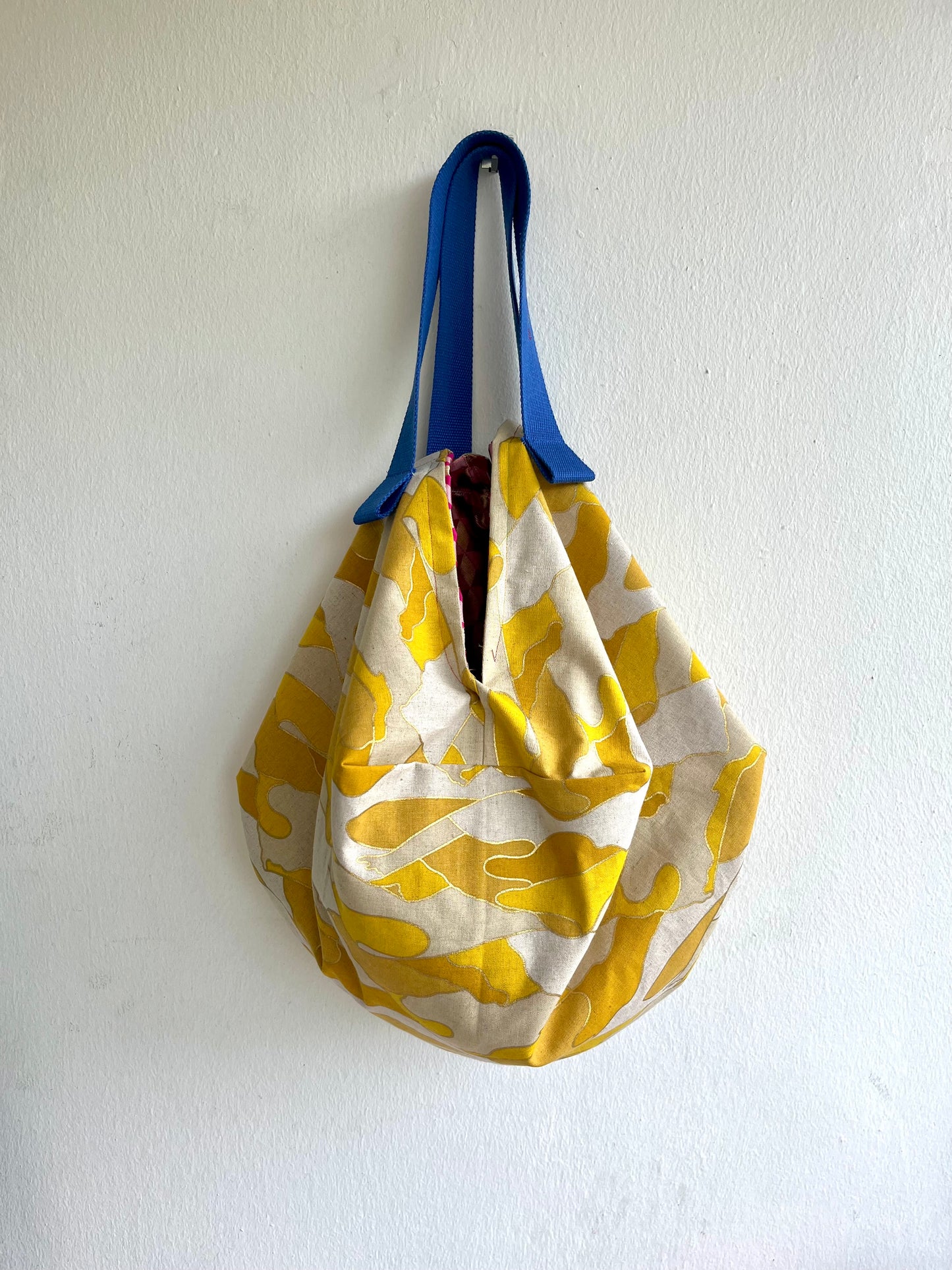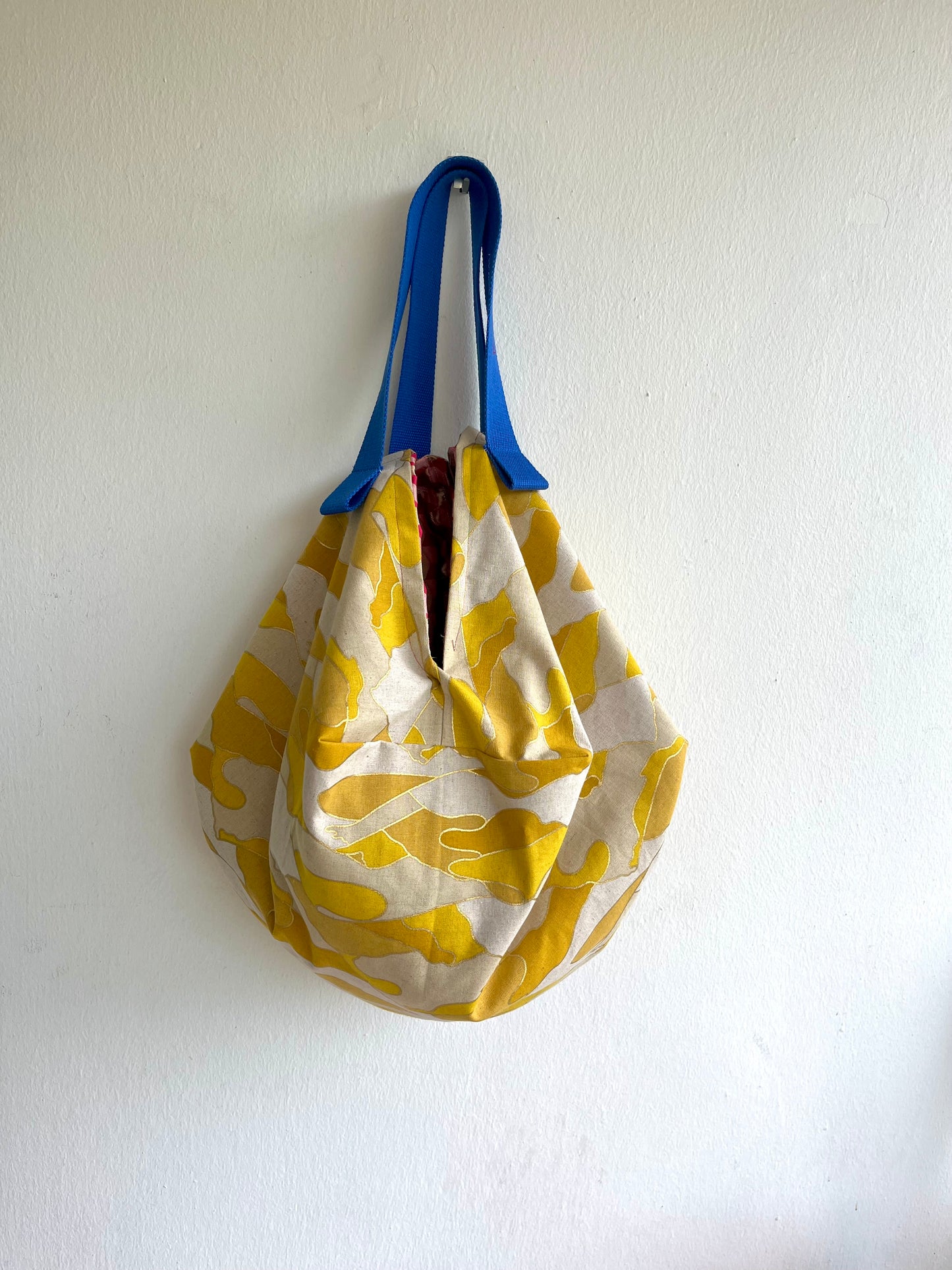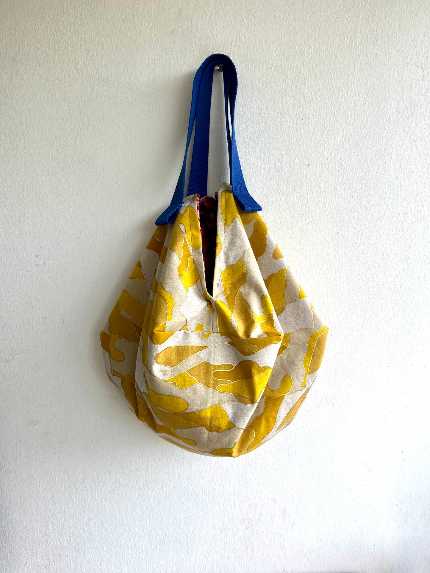 Japanese inspired reversible bag , origami sac bag , reversible fabric bag , shoulder groceries eco bag | Yellow dunes with golden sparkles