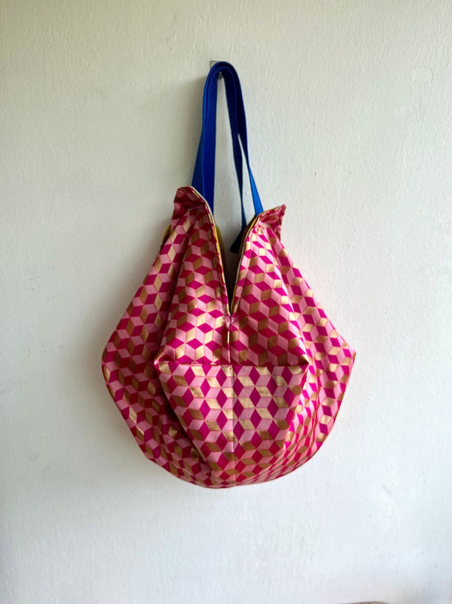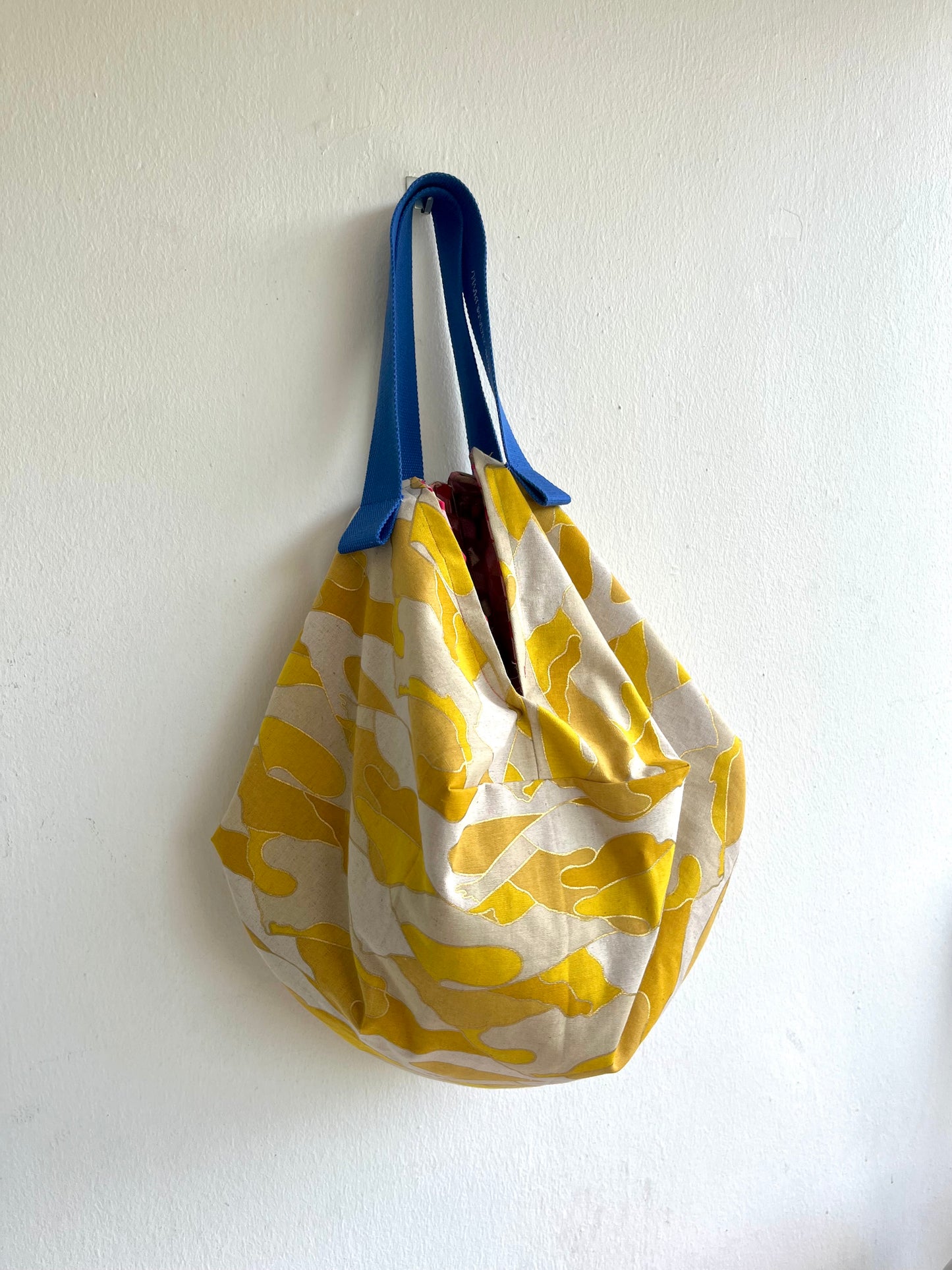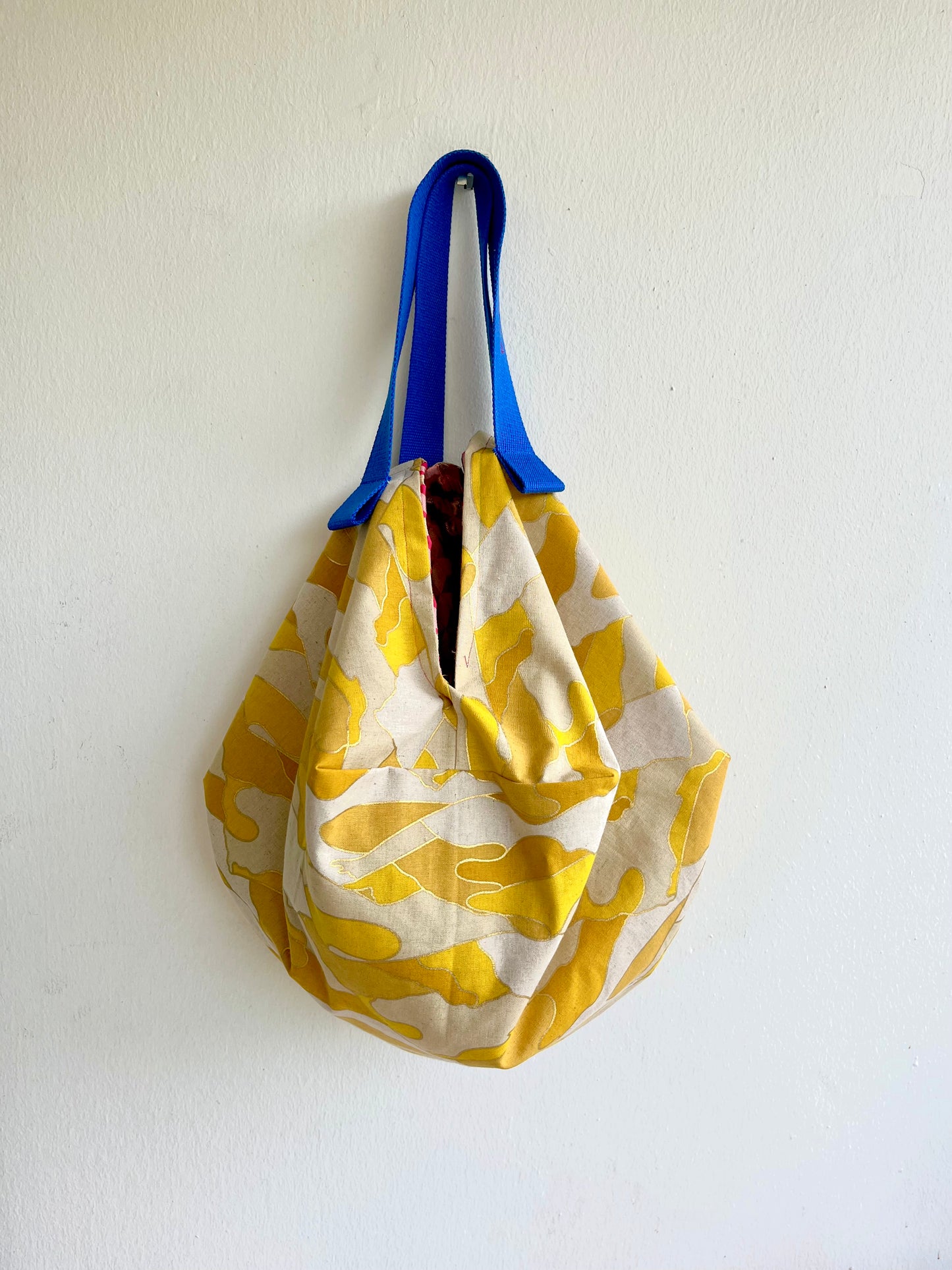 Japanese inspired reversible bag , origami sac bag , reversible fabric bag , shoulder groceries eco bag | Yellow dunes with golden sparkles