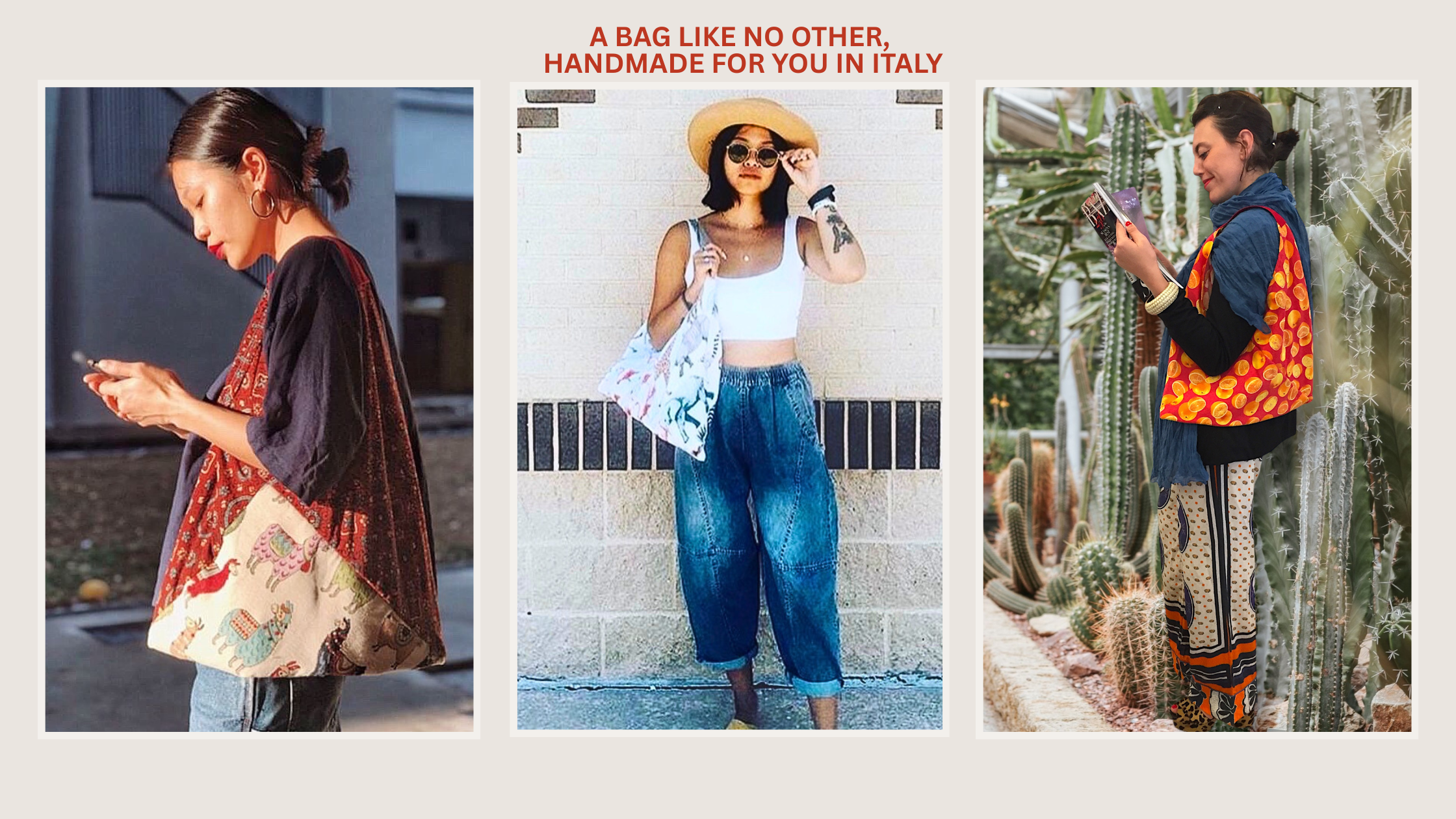 Hi, we are Giacomo and Mar. We make one of a kind bags. Handmade in our Italian atelier using fabrics discovered on our travels. No duplicates, No waste, just light colorful bags with a story.