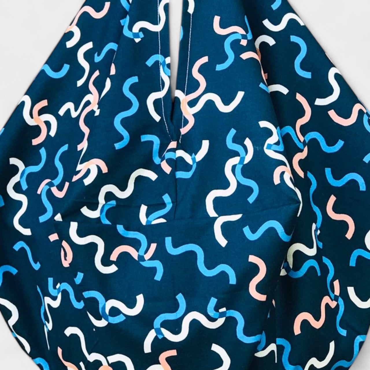 This one-of-a-kind 'Mariko is a really unique piece made with a cool fabric we bought in a market in Japan, and a beautiful bright blue “Brunello” made in Italy fabric.