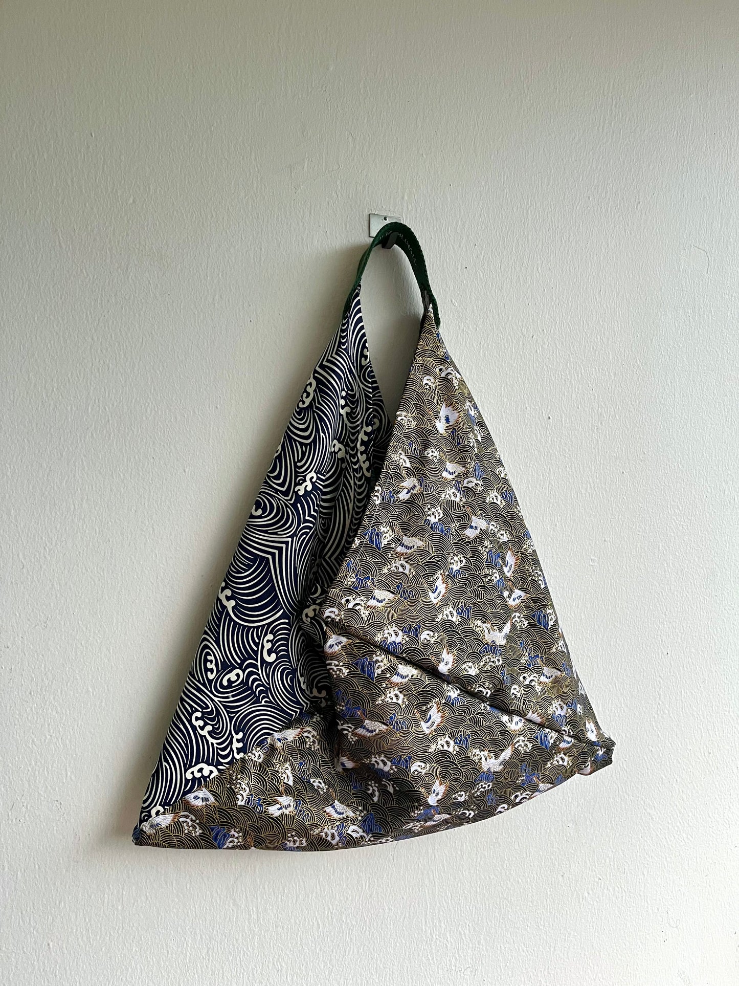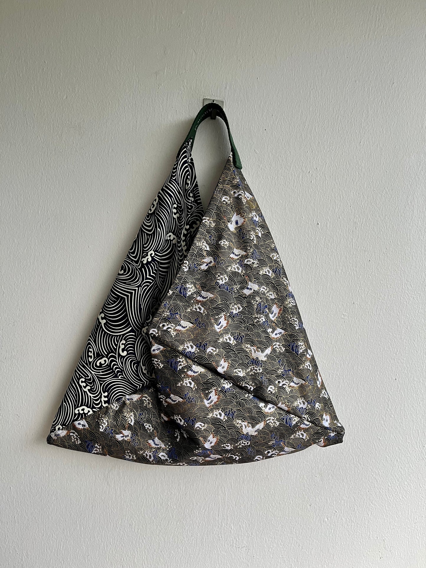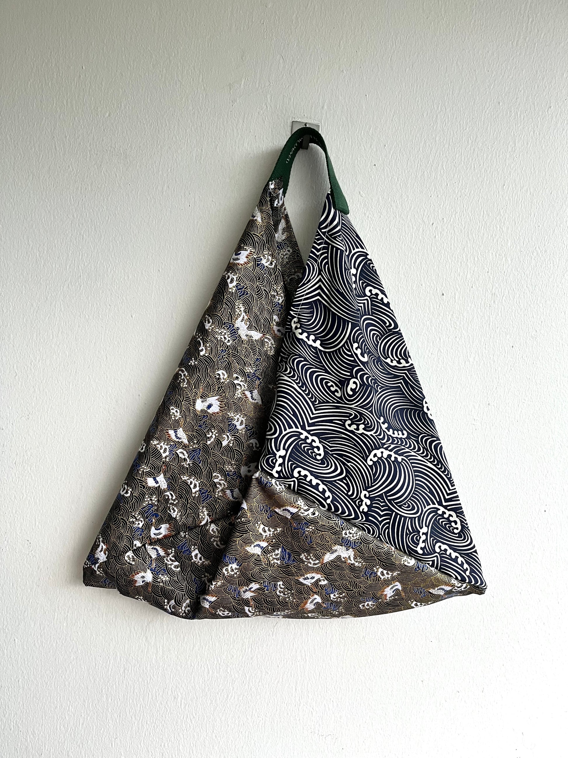Origami tote bag , bento Japanese bag , shoulder triangle fabric bag , handmade gift idea | Stormy sea in the shores of Japan