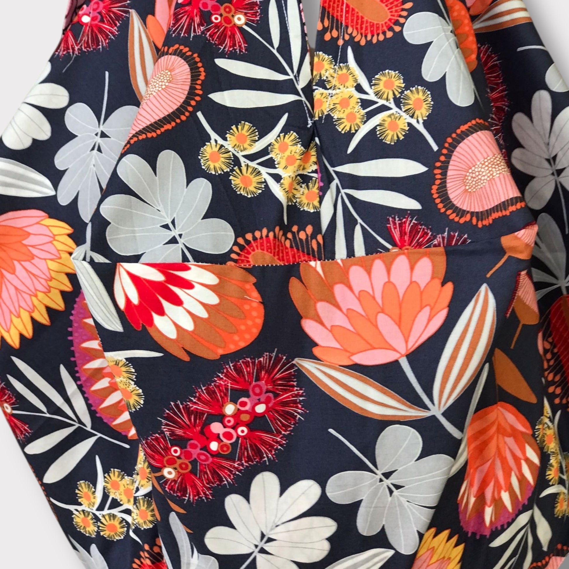 This one-of-a-kind 'Mariko is designed with a cool traditional Japanese waves fabric that we bought in Tokyo. For the reverse side we chose a beautiful flower garden fabric that we bought in a market in Sydney.