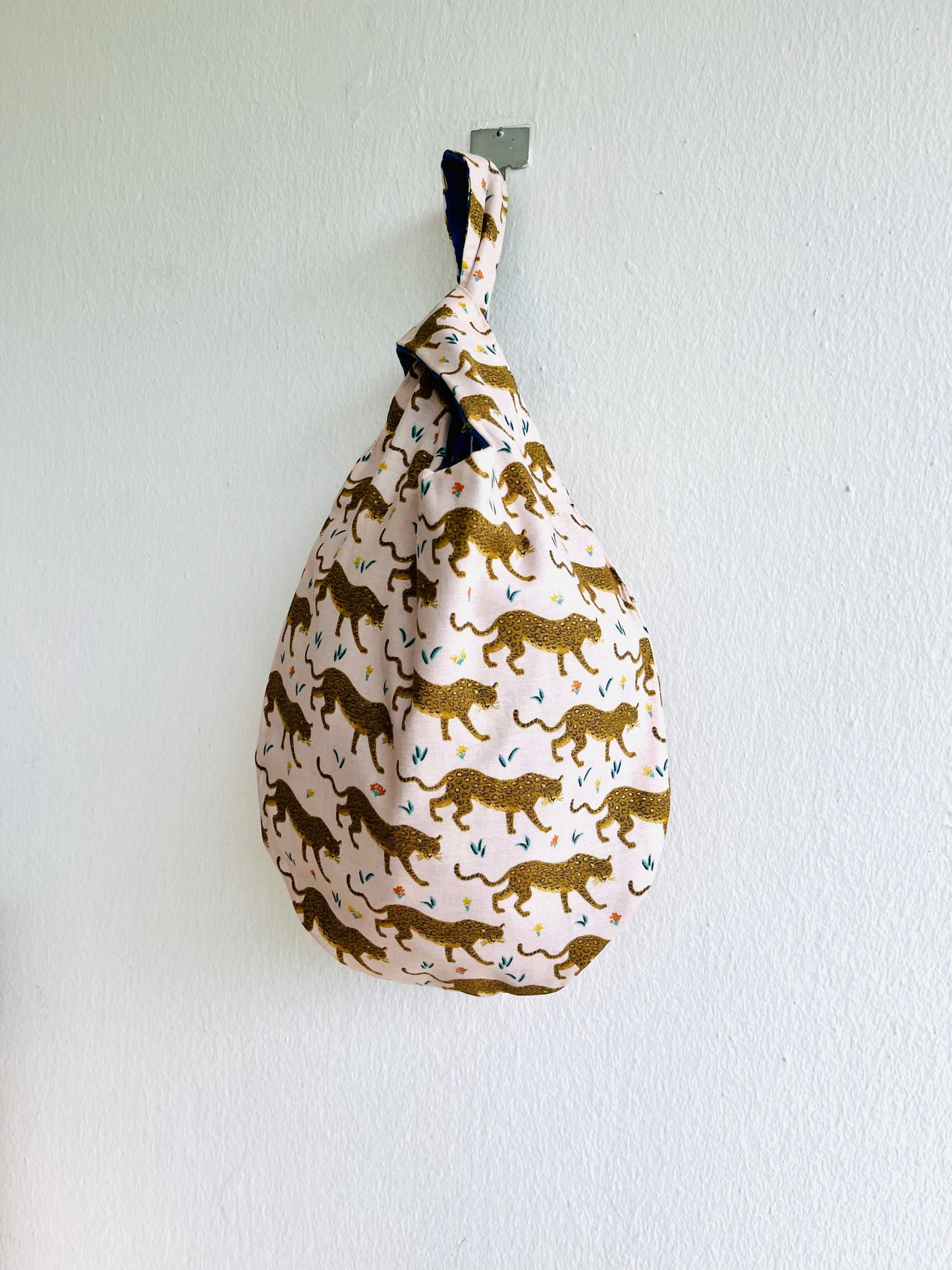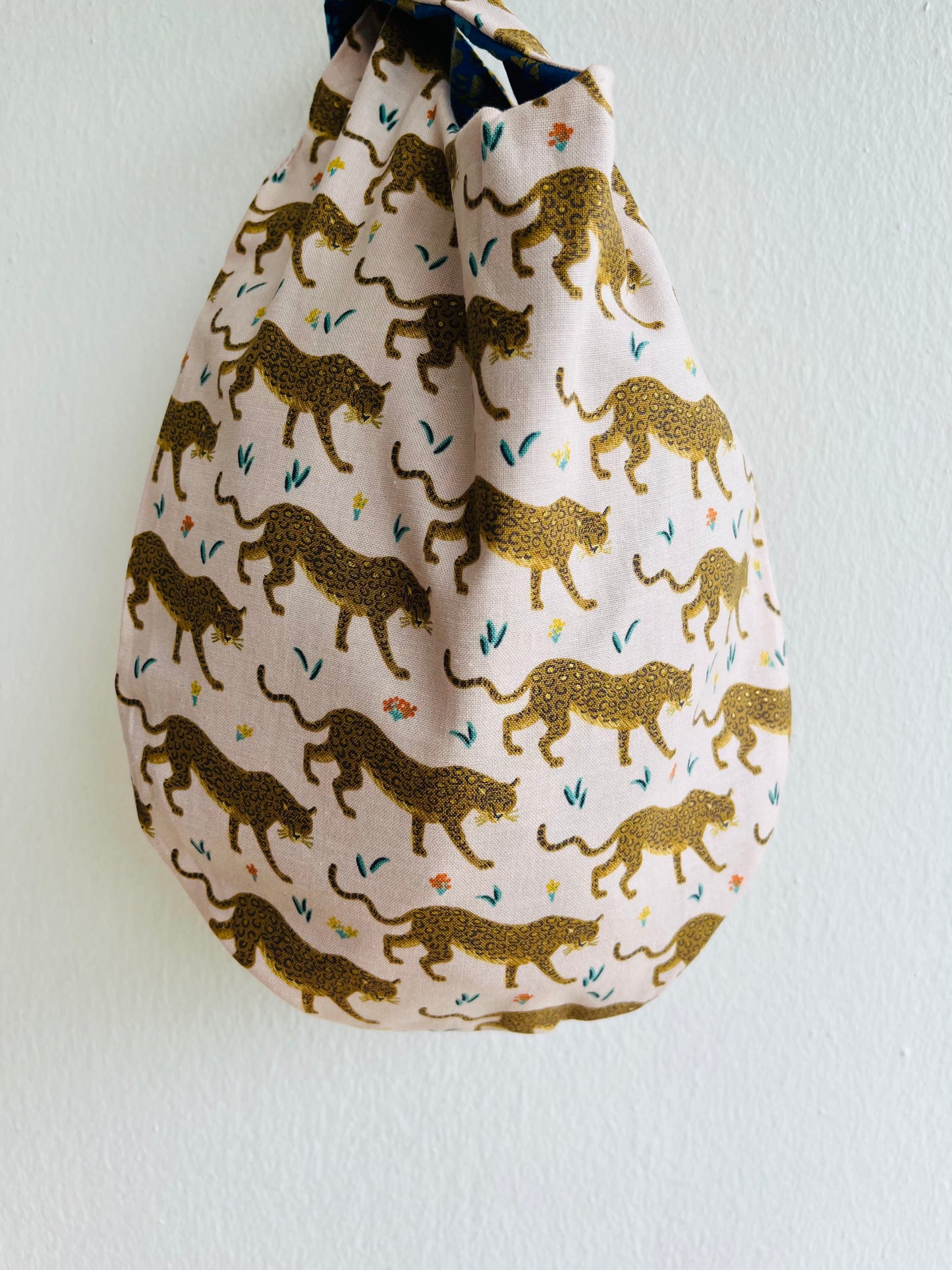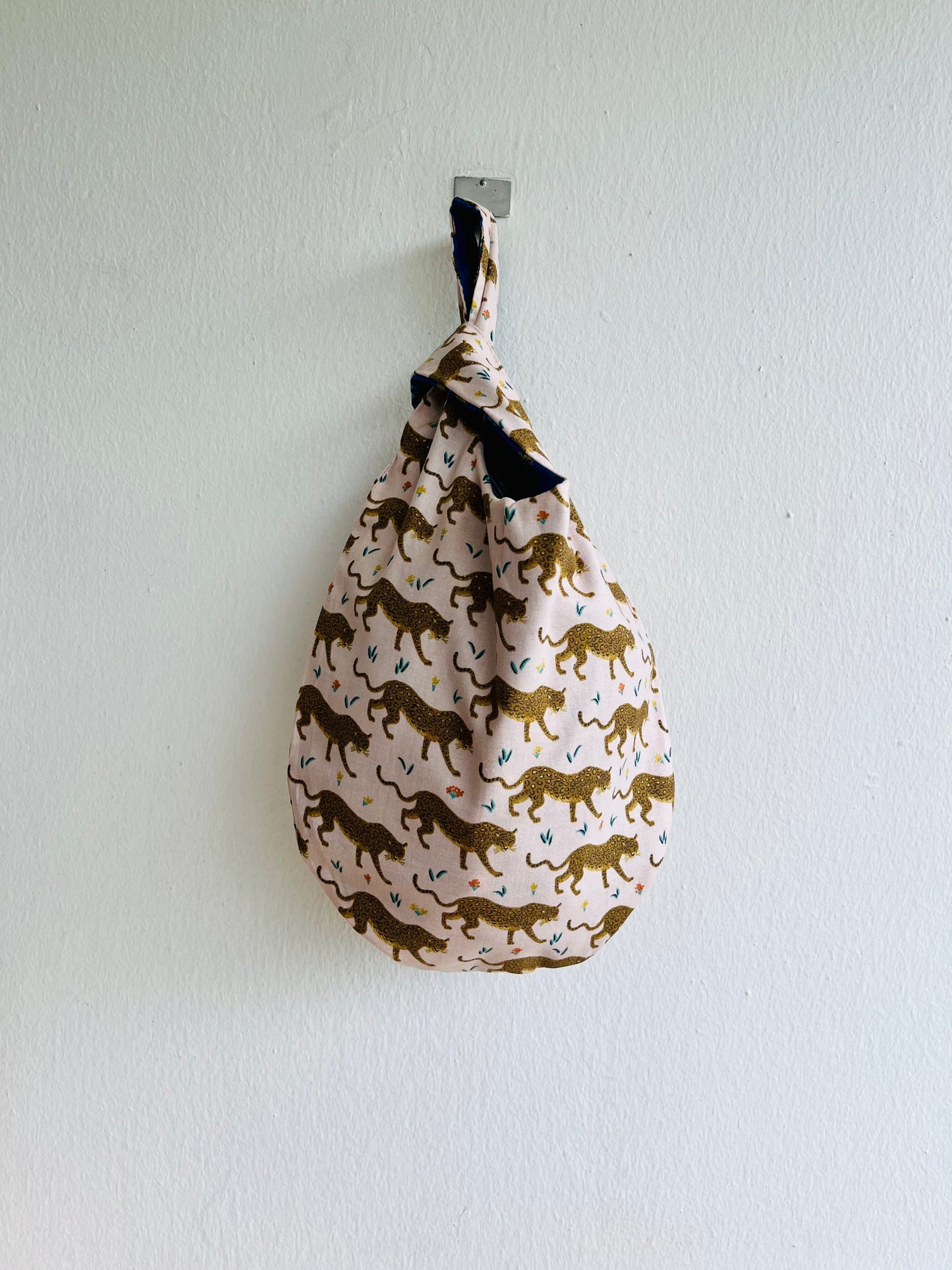 Origami knot bag , reversible Japanese inspired wrist bag , colorful eco friendly small bag | Is it a tiger or a leopard?
